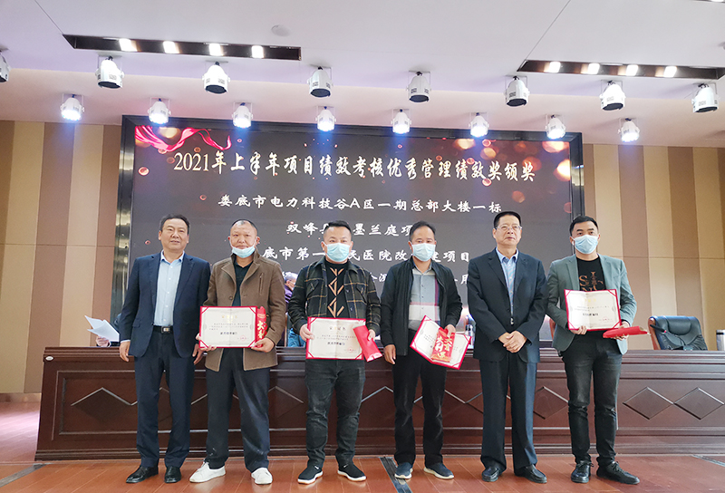 5黨支部書記林有良(右二)、總經(jīng)理助理姜建輝(左一)為績(jī)效考核中獲得優(yōu)秀管理績(jī)效項(xiàng)目頒獎(jiǎng)